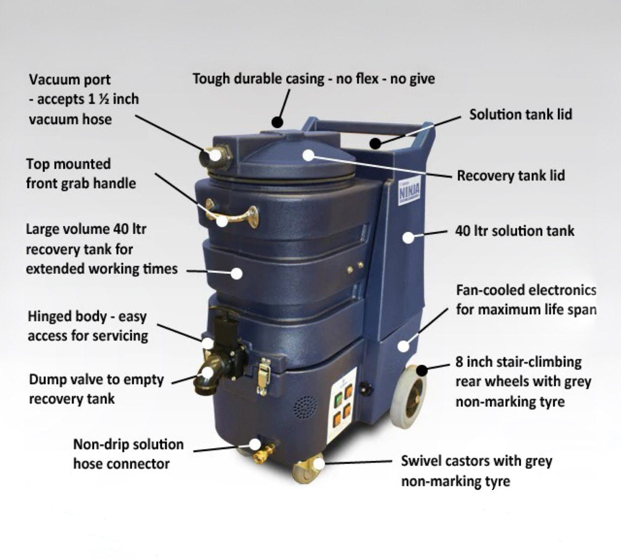 Both these heating systems run from a 2nd power lead. There is a 3 position switch which allows you to select either the in-tank heater, the inline V2 SteamMate heat exchanger or turn them both off. With this machine you will not want for hot water! This Ninja’s heat performance is incredible and controllable. We believe this Ninja has the most powerful heating system of any portable.