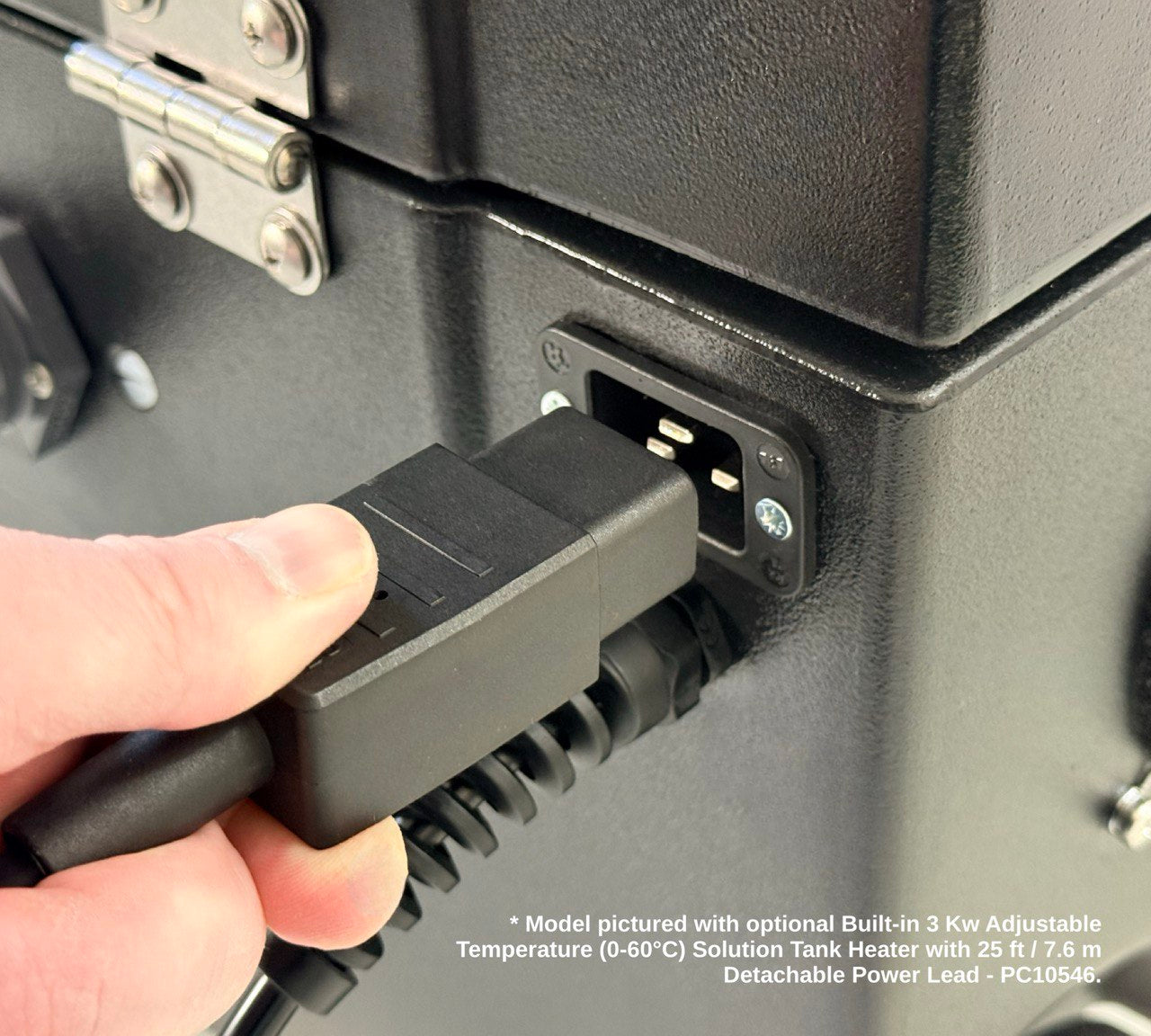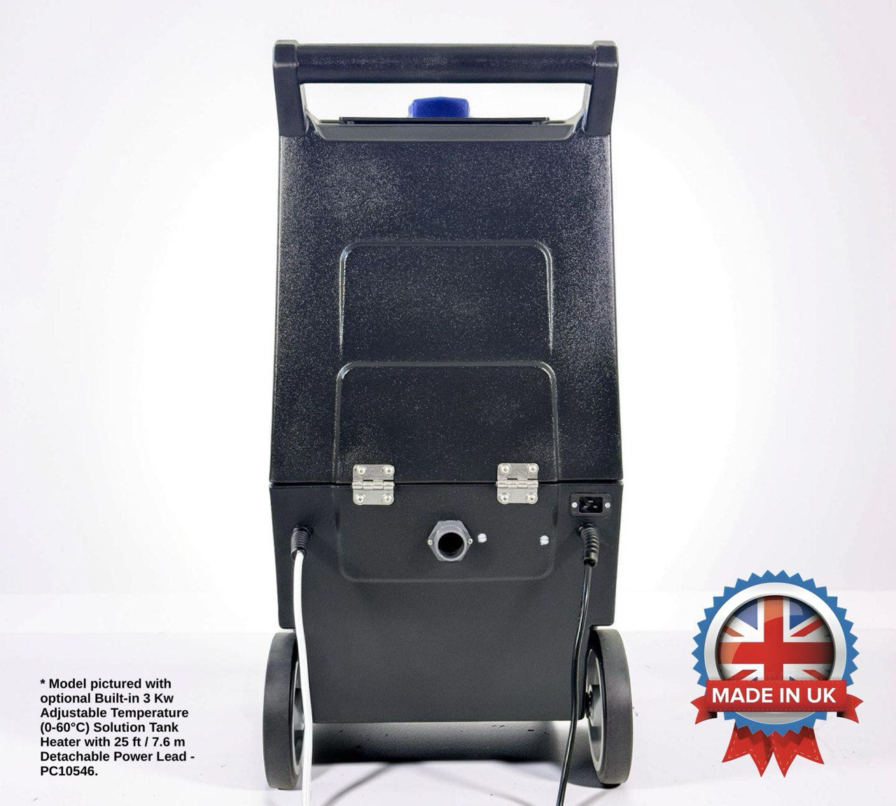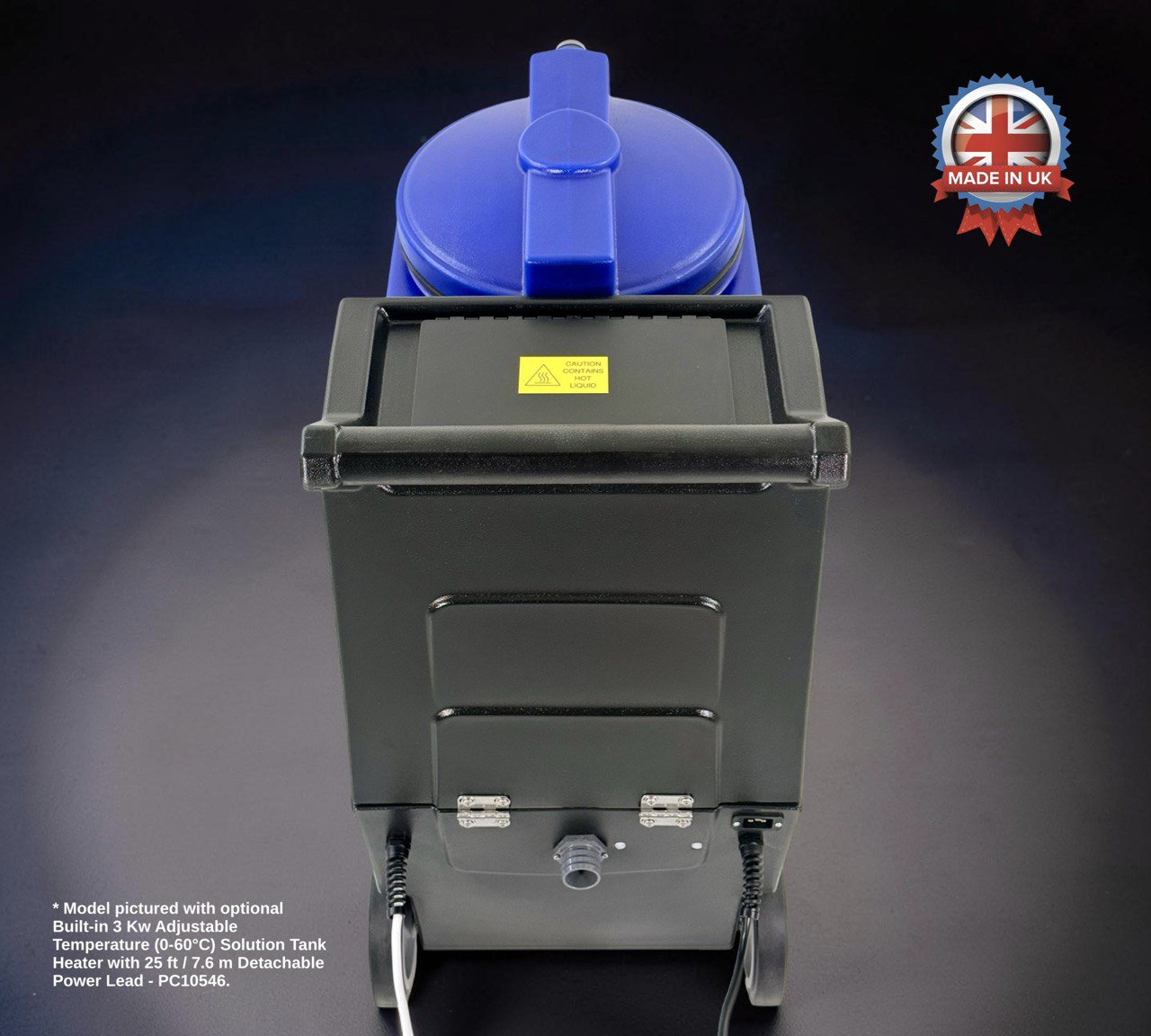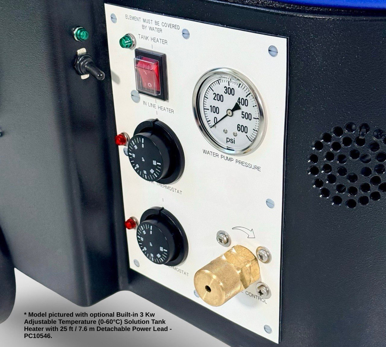 Positioned in the solution (clean water) tank and designed for use with 400 psi machine builds. 3 kW power with fully adjustable temperature from 0-60ºC and protected via a safety cut-off, which automatically switches off the system when cleaning solution level is low.